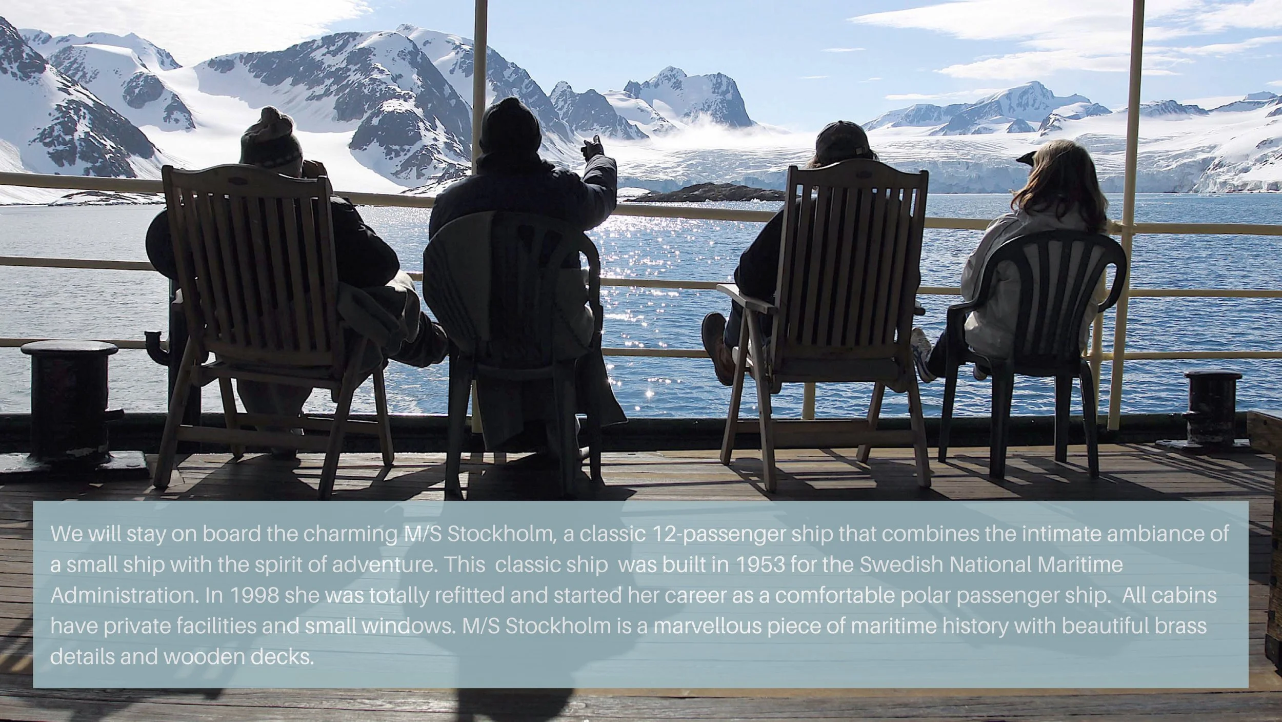 Our boat is the M/S Stockholm which is perfect for small groups and long expeditions. The boat is lower than most so even without boarding the zodiac boats, we can get good angles from the boat.